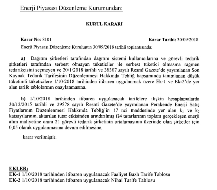 Enerji Piyası Düzenleme Kurumu (EPDK)’nın elektrik abınelerini ilgilendiren kararı Son Mükerrer Resmi Gazetede yayınlandı.