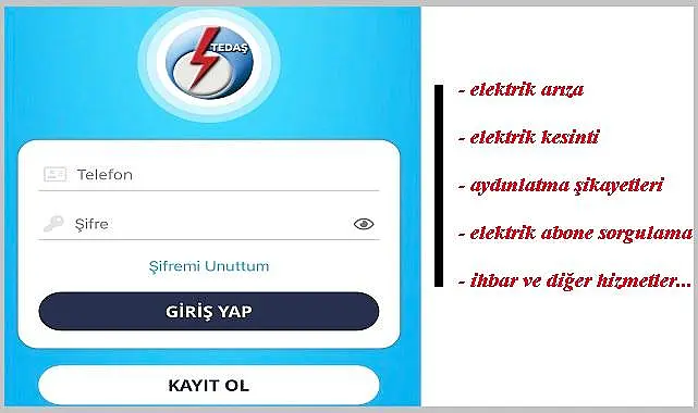 - TEDAŞ'ın yenilediği Elektrik Arıza İhbar uygulaması ile, internet üzerinde kolayca ''elektrik arıza, aydınlatma şikayetleri, kesinti, ihbar, takip, abone sorgulama, abone ekleme vb'' hizmetler kolaylıkla yapılabilir.