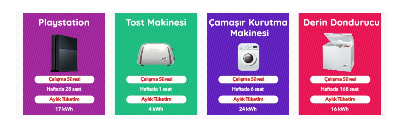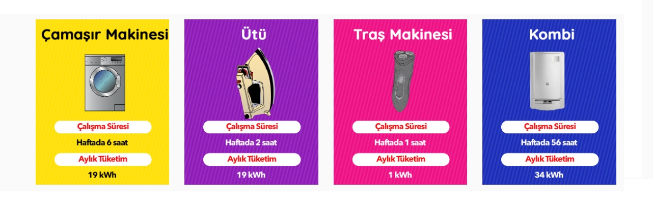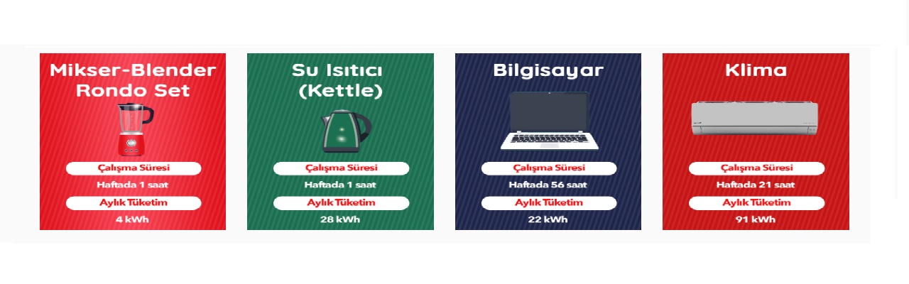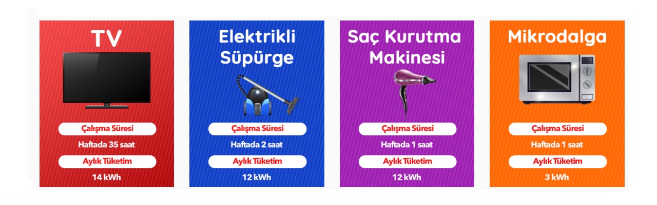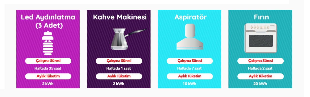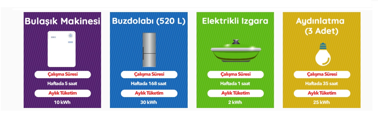 | Elektrikli cihaz | Çalışma süresi | Aylık elektrik tüketimi |