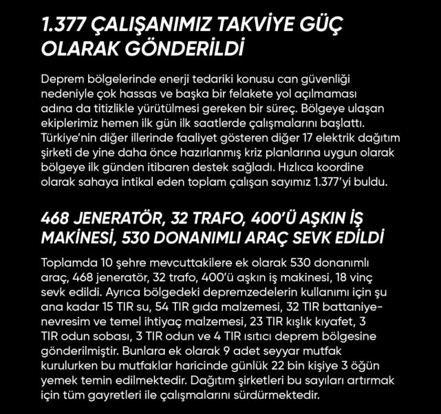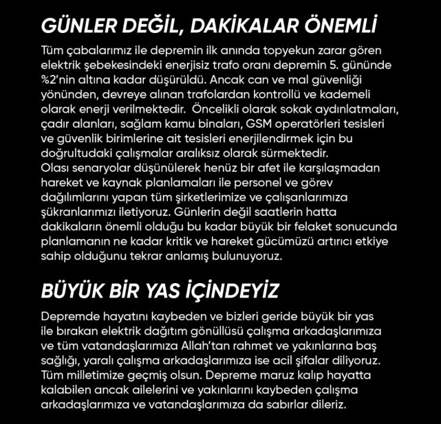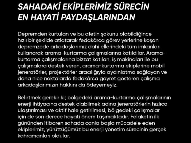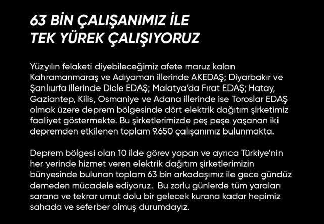- "6 Şubat’ta 10 şehrimizde yaşanan #deprem felaketi sonrasında tüm Türkiye olarak yastayız. Hayatını kaybeden, yaşam mücadelesi veren ve yakınlarını yitiren tüm vatandaşlarımız için büyük bir üzüntü içindeyiz. Afetzedelerimizin yaralarını sarmak için var gücümüz ile çalışıyoruz."