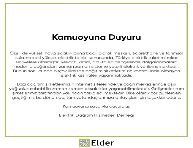 ELDER açıklamasında, son günlerde artan elektrik tüketimi nedeniyle sisteme zaman zaman yeterli elektrik verilemediğine dikkat çekti. ELDER, bunun sonucu olarakta dağıtım sistemi kaynaklı olmayan elektrik kesintileri yaşandığı bilgisine yer verildi.