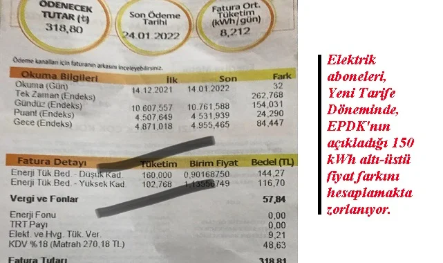 Son günlerde elektrik - doğal gaz faturaları, yoğun konuşulmaya başlandı. Bunun birinci nedeni, yeni yıla zamlı tarifelerle girilmiş olması. Diğer nedeni ise, elektrikte aylık 150 kWh (Kilowatsaat) altı tüketimin indirimli fiyattan ve 150 kWh üzeri tüketimin de pahalı tarifeden ücretlendirilmiş olması. Buna birde fatura döneminin, eski-yeni fiyat dönemlerine sarkması (Aralık 2021 eski fiyat, Ocak 2022 yeni fiyat) eklenince, abonelerin kafası iyice karıştı. Aslında; abonelerle birlikte şirketlerde yeni fatura konusunda zorluklar yaşıyor.