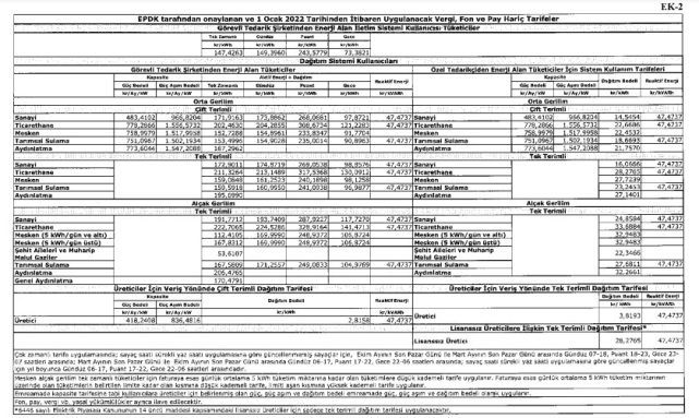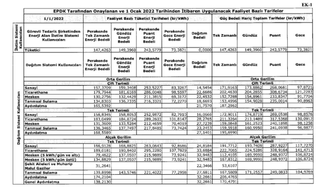 EPDK (Enerji Piyasası Düzenleme Kurumu), 1 Ocak 2022 tarihi itibariyle (3 aylık dönem için) yeni elektrik fiyatlarını açıkladı. Kurum, yeni yılda konut (Mesken) aboneleri için 'Kademeli Tarife' uygulaması başlattı. Kademeli Tarife'ye göre elektrik birim fiyatları (Nihai fiyatlar) 150 kilowatsat (kWh) altı tükeimler için 1,37 TL ve 150 kWh üstü tüketim içinde 2,06 TL olarak açıklandı.Bu fiyatlar, yılın 1. tarife dönemi için geçerli fiyatlar olacak (1 Ocak 2022 - 31 Mart 2022).