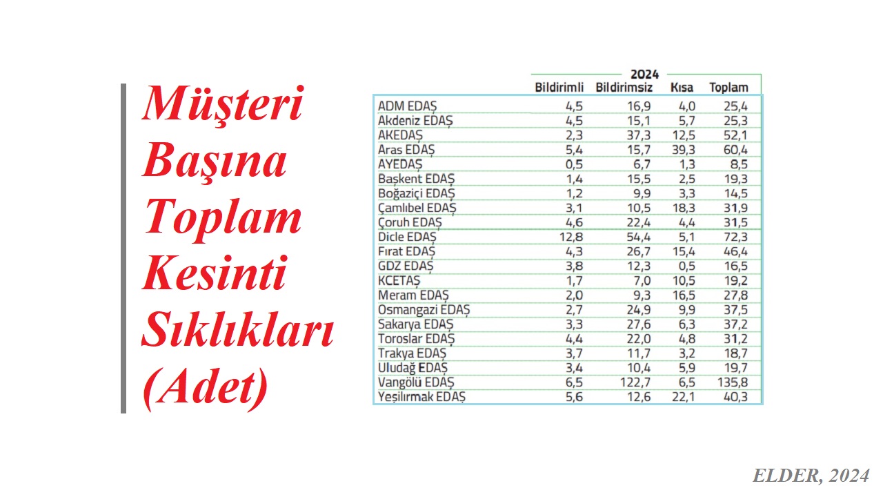 ELDER (Elektrik Daıtım Hizmetleri Derneği) 2024 Yılı Sektör Raporu'na göre, kişi başı en fazla elektrik kesintisi 135 adet ile Vangölü dağıtım bölgesi oldu. Vangölü'nü 72 adet kesinti ile Dicle EDAŞ bölgesi 2. sırada ve 60 adet kesinti ile de ARAS EDAŞ, 3. sırada izledi. Metropol şehir İstanbul Batı Yakası kişi başı elektrik kesintisi 14 adet olurken, Anadolu yakası AYEDAŞ elektrik kesinti sayısı ise 8 oldu.