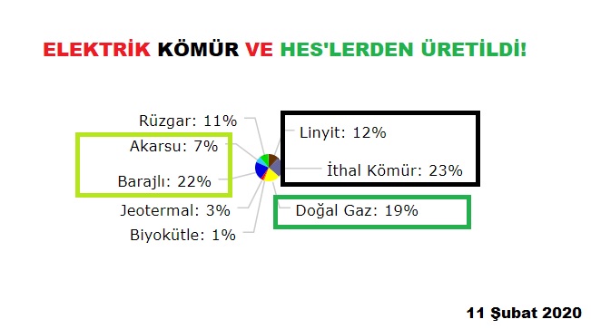 11 Şubat 2020 Salı günü üretilen toplam elektriğin yüzde 35'i kömür santrallerinde, yüzde 29'u ise HES'lerde hidroelektrik - barajlı, akarsu) üretildi. Türkiye Elektrik İletim AŞ (TEİAŞ) Yük Tevzi Bilgi Sistemi (YTBS) verilerine göre, aynı gün doğal gazın toplam elektrik üretimindeki payı ise yüzde 19 oldu.