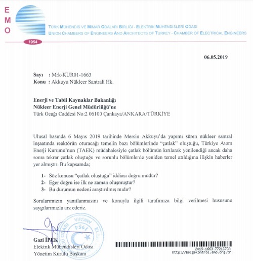 Elektrik Mühendisleri Odası (EMO), Akkuyu Nükleer Santrali sahasında çatlak iddialarıyla ilgili bir açıkalama yaptı. EMO'nun açıklaması şöyle: Ulusal basında 6 Mayıs 2019 tarihinde Mersin Akkuyu`da yapımı devam eden nükleer santral inşaatında, reaktörün oturacağı temelin bazı bölümlerinde iki kez çatlak oluştuğu ve bu bölümlerin kırılarak yeniden yapıldığına ilişkin haberler yer almıştır. Elektrik Mühendisleri Odası (EMO), kamuoyunda endişeyle karşılanan bu haberler üzerine konuyla ilgili detaylı bilgiye ulaşmak ve teknik analiz için Enerji ve Tabii Kaynaklar Bakanlığı`na başvurma kararı almıştır.