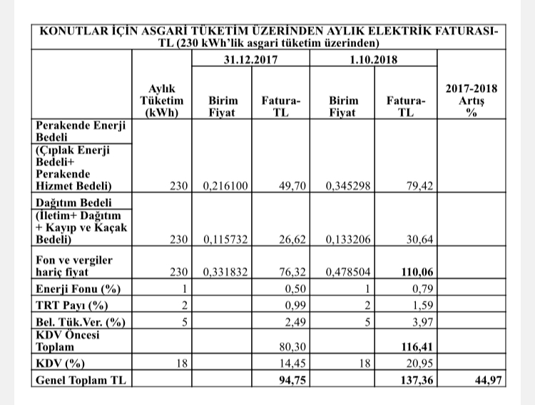EMO’nun konuyla ilgili hesaplama ve açıklaması şöyle: Elektriğe 1 Ekim’de rekor düzeyde zam yapıldı. Konut kullanıcılarının elektrik faturası 2017 yılsonuna göre yüzde 44.9 arttı; sanayi, ticarethane, tarımsal sulama ve aydınlatma tarifelerine yapılan zam ise yüzde 70’i aştı. Asgari tüketimi 230 kilovatsaat olan 4 kişilik bir ailenin elektrik faturasının 137 liraya çıktı.