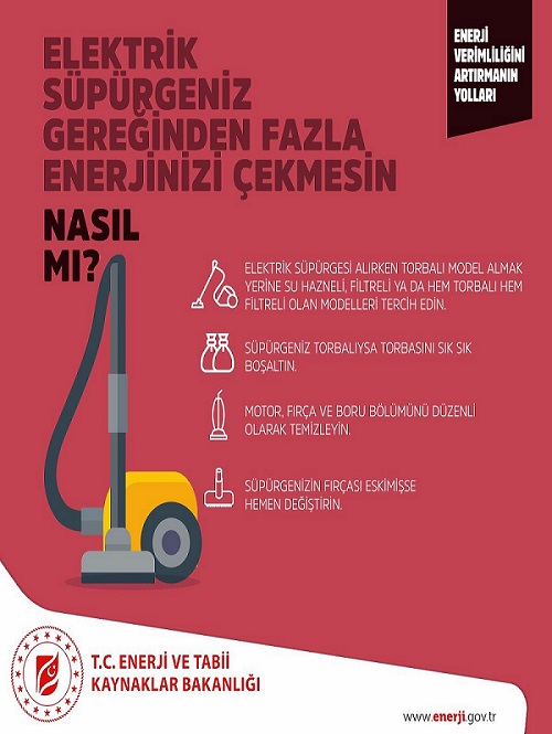 Enerji Ekonomisi - Enerji ve Tabi Kaynaklar Bakanlığı (ETKB), sosyal medya üzerinden 'Enerji Tasarrufuyla' ilgili önemli bilgilendirmeler yapıyor. Bakanlık, elektrik tasarrufuna yönelik ve tabi ödenen faturaları düşüren tasarruf önerilerini sosyal medya hesabı üzerinden paylaşıyor. Enerji Bakanlığı'nın elektrik süpürgesinin tasarruflu kullanımıyla ilgili bilgilendirmesini aşağıda okuyabilirsiniz.
