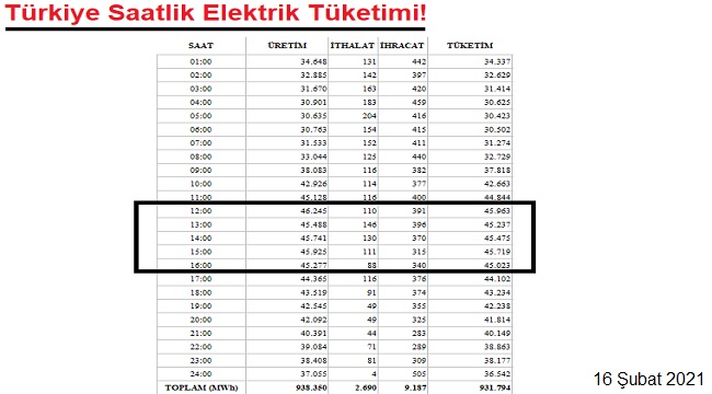 Kaynak: Türkiye Elektrik İletim AŞ (TEİAŞ) Yük Tevzi Bilgi Sistemi (YTBS), 16.02.2021 Pazartesi Verileri.