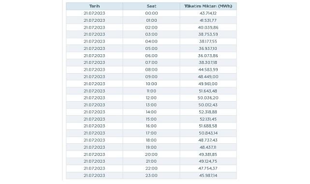 Türkiye günlük elektrik tüketimi dün (cuma günü) zirve yaptı. Ve rekor bir artışla günlük tüketim 1,1 milyar kilowatsaati (kwh) aştı. Resmi verilere göre 21 Temmuz 2023 Cuma günü günlük elektrik tüketimi 1 milyar 104 milyon kwh oldu. Bu rakam, Türkiye'nin zirve elektrik tüketim rakamlarından biri oldu.