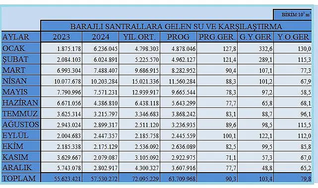 Geçen yıl (2024) elektrik üreten barajlara gelen su miktarı, önceki yıl (2023) barajlara gelen su miktarına yakın gerçekleşti. Geçen yıl barajlara toplam 79,8 milyar metreküp su geldi.