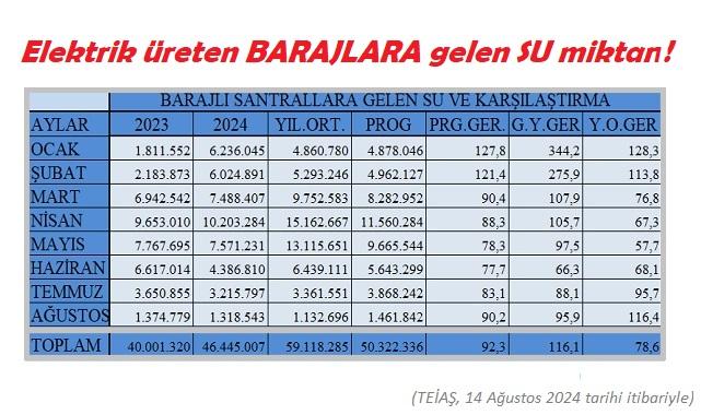 Resmi verilere göre (TEİAŞ), elektrik üreten barajlara gelen su miktarı (14 Ağustos 2024 tarihi itibariyle) 46,4 milyar metreküp (m3) oldu. Bu rakam geçen yıl aynı dönemde 40 milyar metreküp olmuştu. Ancak barajara gelen su miktarı geçen yıla göre artış gösterse de yıllık ortalamaının gerisinde kaldı (Yıllık ortalama 59,1 milyar metreküp).