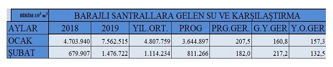 Ocak ayında su gelirlerinde yaşanan artış, Şubat ayında da devam etti. Yine TEİAŞ verilerine göre elektrik üreten barajlara Şubat ayında (6 Şubat itibariyle) barajlara gelen su miktarı 2018 yılında 679.9 milyon metreküp iken bu rakam 2019 Şubat'ta 1,4 milyar metreküpe çıktı. Ocak ve Şubat aylarında barajlara gelen bu su miktarıyla; hem yıllık ortalamanın ve hemde yıllık programın üzerine çıkılmış oldu.