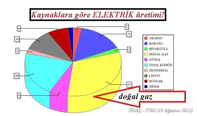 Türkiye kaynaklara göre elektrik üretiminde doğal gaz ilk sıraya yükseldi. Resmi verilere göre 16 Ağustos 2023 Çarşamba günü Türkiye toplam elektrik üretiminin yüzde 31'ini doğal gaz çevrim santralleri üretti. Doğal gazı yüzde 21 pay ile ithal kömür santralleri ikinci sırada izledi. HES'ler (Barajlı - Akarsu) ise elektrik üretiminde 15 pay ile 3. sırada yer aldı.