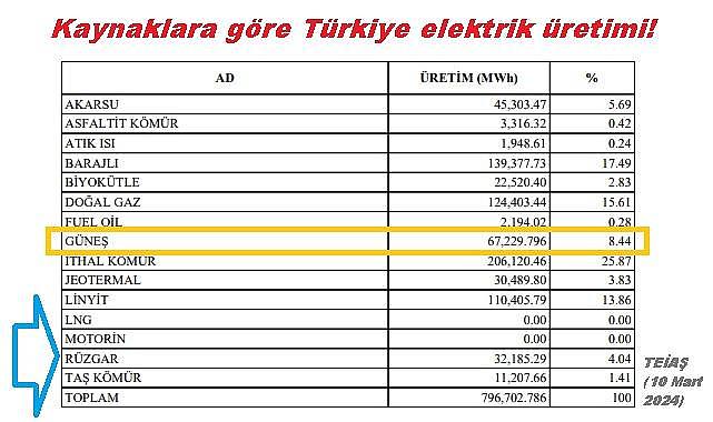 Kaynaklara göre elektrik üretimi: Resmi veriler göre (TEİAŞ - YTBS), Türkiye elektrik üretiminde kaynaklara göre dağılımda güneşin payı (10 Mart pazar) yüzde 8,44'e oldu. Buna karşın bir diğer yenilenebilir kaynak olan rüzgar santrallerindeki elektrik üretimi ise yüzde 4i04 oldu. HES'lerde (akarsu - barajlı) üretim ise aynı gün yüzde 23 0ldu.