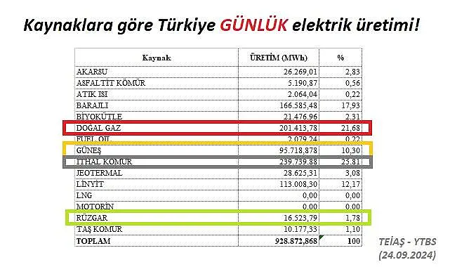 Resmi verilere göre (TEİAŞ-YTBS), dün (24 Eylül 2024, Salı) günü Türkiye toplam elektrik üretimindeithal kömür santrallerinin payı yüzde 25 v doğal gaz santrallerinin payı da yüzde 21 oldu.