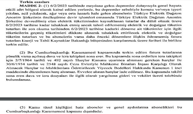 Resmi Gazete de yayınlandı: Deprem bölgesindeki abonelerin elektrik borçları 6 Şubat 2023 tarihi itibariyle terkin edildi (silindi). Konuyla ilgili ''Olağanüstü Hal Kapsamında Enerji Tüketim Bedellerinin Terkinine Dair Cumhurbaşkanlığı Kararnamesi'' bugünkü Resmi Gazete de yayınlandı 21 Mart 2023 tarih ve 32139 sayılı Resmi Gazete). Elektirk ve doğal gaz faturaları (6 Şubat 2023 itibiriyle), Enerji ve Tabi Kaynaklar Bakanlığı bütçesinden karşılanacak.