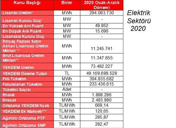 (EPDK, Ocak - Aralık 2020 dönemi)