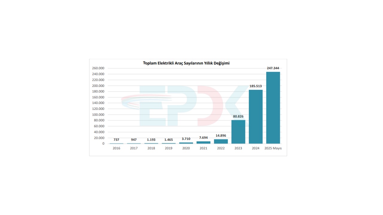 Enerji Piyasası Düzenleme Kurumu (EPDK), '' Şarj Hizmeti Piyasası Aylık İstatistikleri-Mayıs 2025'' verilrine göre Türkiye'de toplam 247.344 adet elektrikli araç var.