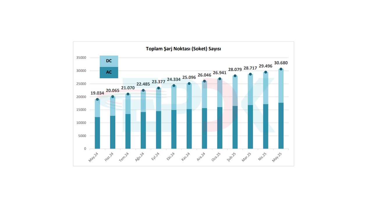 Enerji Piyasası Düzenleme Kurumu (EPDK), '' Şarj Hizmeti Piyasası Aylık İstatistikleri-Mayıs 2025'' Türkiye'de toplam 30.680 şarj istasyonu (şarj noktası, AC - DC var).