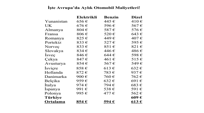 LeasePlan Araç Maliyet Endeksi’ne göre, fosil yakıtlı araç kullanmanın maliyetinin en yüksek olduğu ülkelerin başında Hollanda ve Norveç geliyor. Hollanda’da dizel bir araca sahip olmanın aylık ortalama maliyeti 937 Euro iken, benzinli araç maliyeti 783 Euro, elektrikli araç maliyeti 872 Euro. Norveç’te ise dizel bir araca sahip olmanın aylık ortalama maliyeti 821 Euro iken, benzinli bir araca sahip olmanın maliyeti 851 Euro, elektrikli araç maliyeti ise 833 Euro. Sonuç olarak elektrikli araçlar Hollanda’da dizelden, Norveç’te de benzinli araçtan daha ucuz konumlanıyor. GSYİH dikkate alındığında toplam araç sahipliği maliyetinin en düşük olduğu ülkeler Yunanistan ve Birleşik Krallık iken, en yüksek maliyetlerin Hollanda ve İtalya'da olması dikkatleri çekiyor. Yunanistan’daki sürücüler yalnızca 410 Euro aylık ortalama maliyetle dizel yakıtlı bir araca sahip olabiliyor.