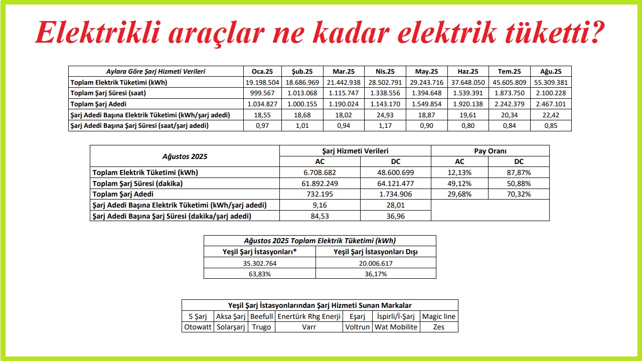 - Enerji Piyasası Düzenleme Kurumu (EPDK), Şarj Hizmeti Piyasası Aylık İstatistikleri Ağustos 2025 verilerini yayınladı. EPDK Enerji Dönüşüm Dairesi Başkanlığı'nın yayıladığı istatistiklerde, şarj istasyonu sayısından elektrik tketimine, şarj sektörüyle ilgili ayrıntılı bilgilere yer veriliyor.