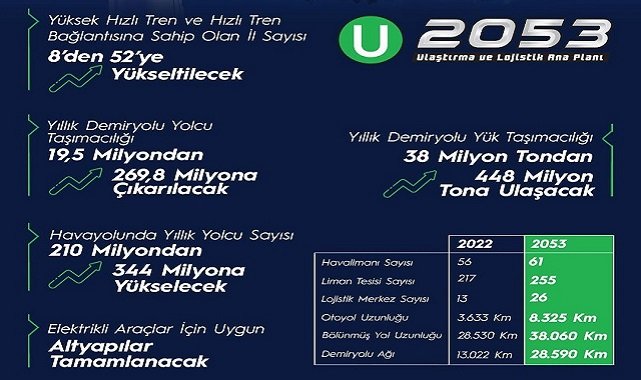 - 2053 Ulaştırma ve Lojistik Ana Planı'nda öne çıkan ayrıntılardan birisi de, 'elektrikli araçlar için altyapının tamamlanma'sı hedefi oldu.