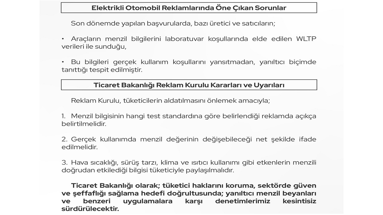 Ticaret Bakanlığı; elektrikli araç satıcıların reklamlarında menzil bilgilerine yer vermelerina karşın, rakamların gerçek kullanım koşullarını yansıtmadığını tespit etti. Bakanlığa göre, reklamlarda elektrikli araç menzil verilerinin 'hangi koşullarda ve standartlarda' belirlendiği bilgilerine net yer verilmeli. Ve, gerçek kullanımda menzil değerinin net olarak belirtilmesi gerekiyor.