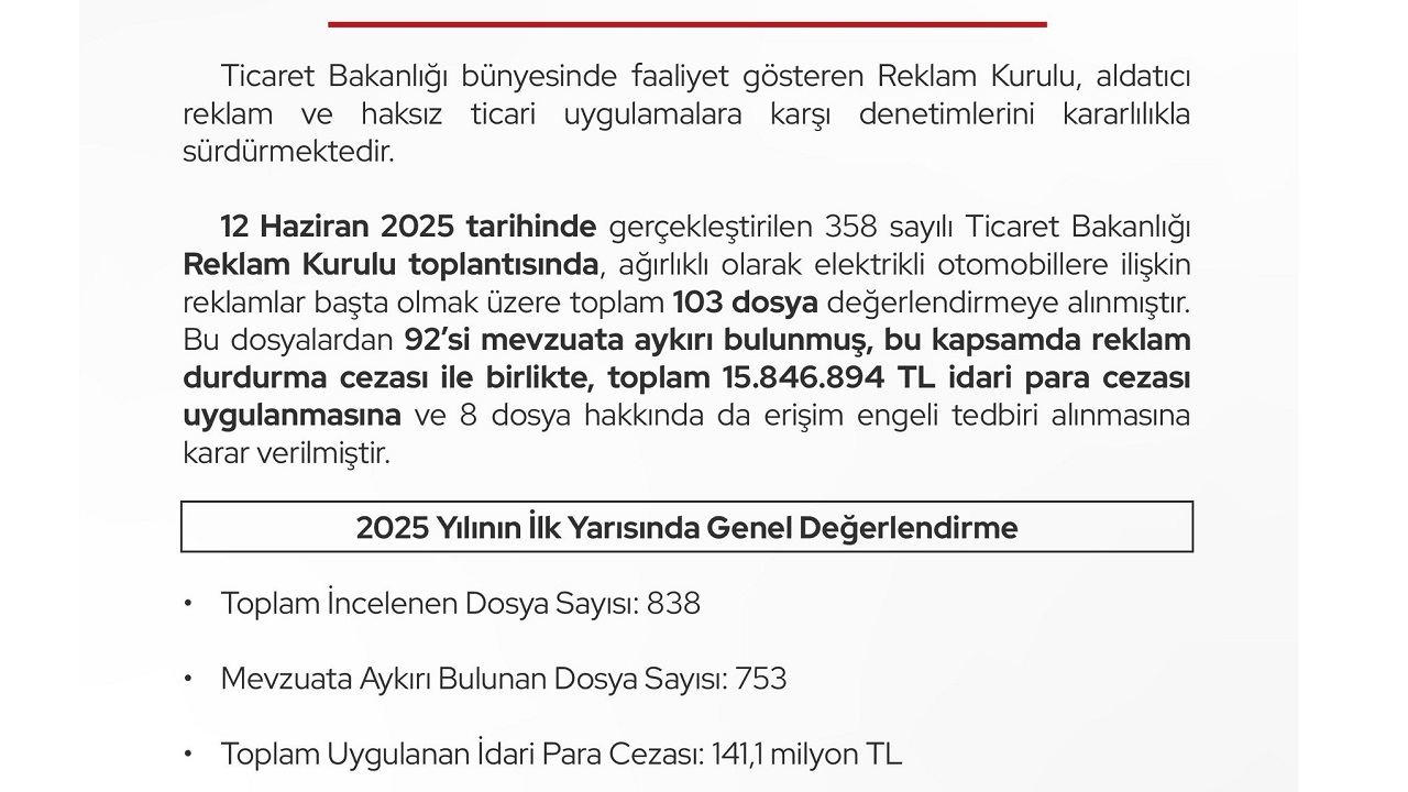 Ticaret Bakanlığı, elektrikli araçlarda tüketiciyi yanıltan reklamları takibe aldı. Bakanlık bu kapsamda, toplam 838 dosyayı incelemeye aldı. Bu dosyalardan 753’ü mevzuata aykırı bulundu. Ve bu dosyalara bakanlık 141,1 milyon TL cezai işlem uyguladı. Bakanlık, bu dosyalardan elektrikli araçlarla ilgili olan 103’nün 92’si, elektrikli araçların menzil konusu oluşturdu. Yasalara aykırılık teşkil eden bu dosyalara 15,8 milyon lira idari para cezası kesildi.