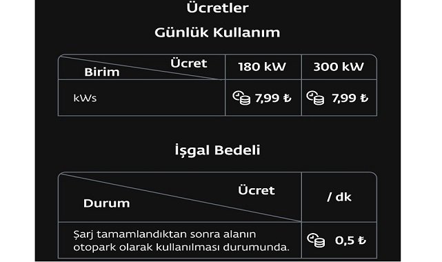 Şarj istasyonlarındaki işgal bedeli ise (şarj tamamlandıktan sonra alanın otopark olarak kullanılması halinde) dakikası (dk) 0,5 lira.