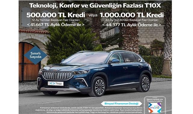 Stoklarla sınırlı finansman desteği kapsamında bireysel ve kurumsal müşteriler için farklı alternatifler yer alıyor. Bu kapsamda bireysel kullanıcılar T10X V2’de 500 bin TL kredi için %0 faizli 12 ay vade ve 41 bin 667 TL geri ödemeli veya 1 milyon TL kredi için 48 ay vadeli 44 bin 377 TL geri ödemeli seçenekler arasından bir tercih yapabilecek. Kurumsal kullanıcılar ise 1 milyon 500 bin TL krediden 48 ay vadeli aylık 60 bin 904 TL geri ödemeli şekilde yararlanabilecek.