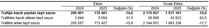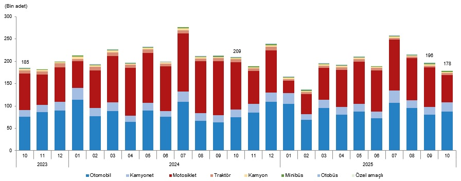 Motorlu Kara Taşıtları: Ekim 2025 Ekim ayında 178 bin 481 adet taşıtın trafiğe kaydı yapıldı.
