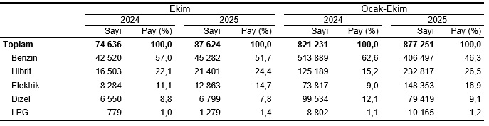 - Trafiğe kaydı yapılan otomobillerin yakıt cinslerine göre dağılımı, Ekim 2025