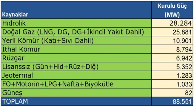 Aynı bilgi paylaşımında Türkiye Elektrik Enerjisi Toğlam Kurulu Gücü ise 88.551 MW olarak yer aldı.