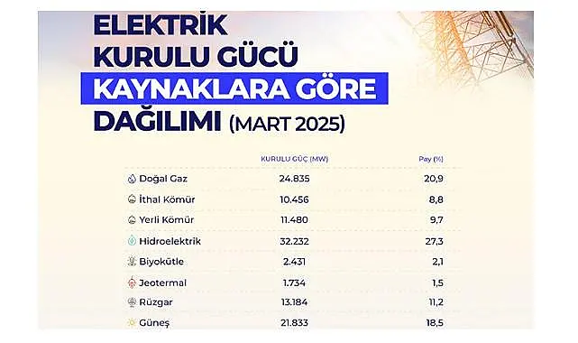Mart ayı sonu itibarıyla yerli kaynaklı kurulu güç de 82 bin 894 megavata ulaştı. Böylece yerli kaynakların toplam kurulu güçteki payı, yüzde 70,1’e çıktı. Bu oran, 2024 Mart’ında yüzde 67 idi.
