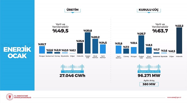 -Ocak ayında elektrik üretiminde, yerli ve yenilenebilir enerjinin payı, yüzde 49,5 oldu.
