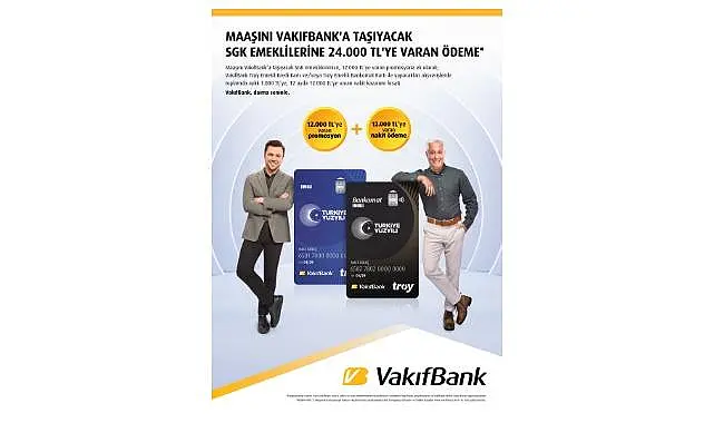 VakıfBank, SGK emeklilerine özel olarak düzenlediği kampanya ile emekli maaşını VakıfBank’a taşıyacak müşterilerine toplam 24.000 TL'ye varan nakit ödeme fırsatı sunuyor. 30 Eylül 2024’e kadar geçerli olan kampanya kapsamında, 12.000 TL’ye varan promosyon ödemesine ek olarak, 12 ay boyunca VakıfBank Troy Emekli Kredi Kartı ve/veya Bankomat Kartı ile yapılacak alışverişlerde aylık kart bazında toplamda maksimum 500 TL olmak üzere 12.000 TL'ye varan nakit ödeme avantajı sağlanıyor.