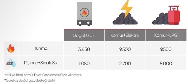 Konutlar için yıllık fatura (enerji) giderleri (Isınma amaçlı, 2023 yılı): Doğal gaz 3 bin 450 lira, kömür-elektrik 9 bin 500 lira ve kömür-LPG 9 bin 500 TL.