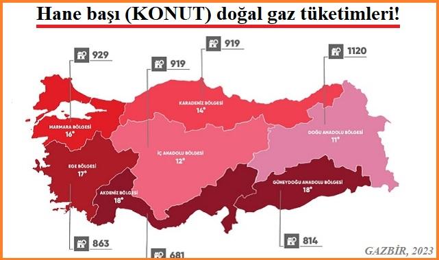 Konutlar (2023 yılı) için ocak ayı doğal gaz tüketimi 2 milyar 781 milyon metreküp (m3), şubat ayı doğal gaz tüketimi 2 milyar 948 milyon metreküp, Mart ayı doğal gaz tüketimi 2 milyar 746 milyon metreküp, Nisan ayı doğa gaz tüketimi 1 milyar 580 milyon metreküp, Mayıs ayı doğal gaz tüketimi 1 milyar 834 milyon metreküp, Haziran ayı doğal gaz tüketimi 688 milyon metreküp, Temmuz ayı doğal gaz tüketimi 363 milyon metreküp, Ağustos ayı doğal gaz tüketimi 278 milyon metreküp, Eylül ayı doğal gaz tüketimi 286 milyon metreküp, Ekim ayı doğal gaz tüketimi 409 milyon metreküp, Kasım ayı doğal gaz tüketimi 746 milyon metreküp ve aralık ayı doğal gaz tüketimi 2 milyar 274 milyon metreküp.