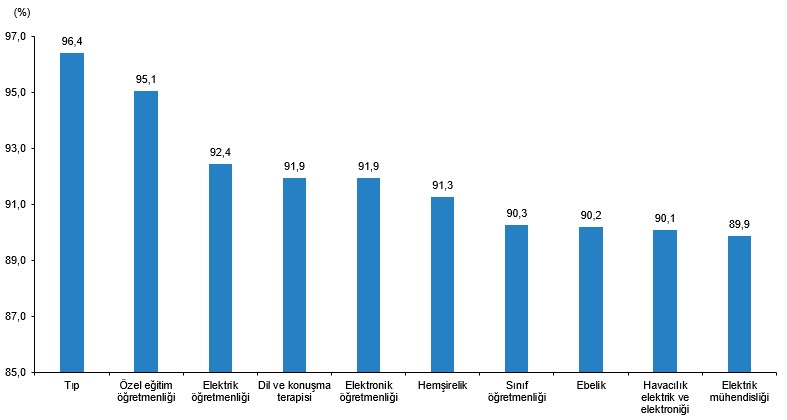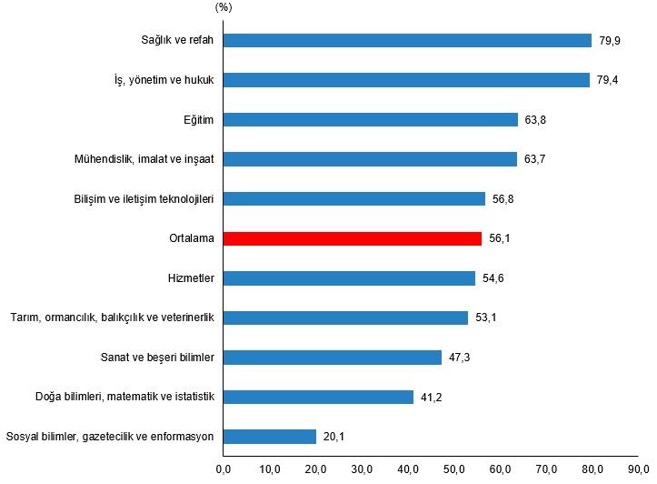 Ücretli çalışan (SGK 4/A) lisans mezunlarının öğrenim gördükleri eğitim ve öğretim alanı ile uyumlu bir meslek grubunda çalışma oranının en yüksek olduğu ilk beş alan; sağlık ve refah (%79,9), iş, yönetim ve hukuk (%79,4), eğitim (%63,8), mühendislik, imalat ve inşaat (%63,7) ile bilişim ve iletişim teknolojileri (%56,8) oldu. En düşük uyum ise %20,1 ile sosyal bilimler, gazetecilik ve enformasyon alanında gerçekleşti.