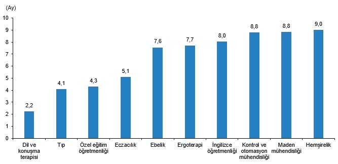 Lisans mezunlarının mezuniyetleri sonrası ilk iş bulma süre ortalamasının en kısa olduğu bölümler; dil ve konuşma terapisi (2,2 ay), tıp (4,1 ay), özel eğitim öğretmenliği (4,3 ay), eczacılık (5,1 ay) ile ebelik (7,6 ay) oldu.