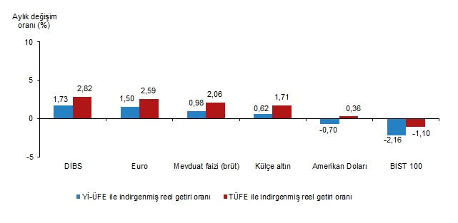 Yİ-ÜFE ile indirgendiğinde; yatırım araçlarından Euro %1,50, mevduat faizi (brüt) %0,98 ve külçe altın %0,62 oranlarında yatırımcısına reel getiri sağlarken; Amerikan Doları %0,70 ve BIST 100 endeksi %2,16 oranlarında yatırımcısına kaybettirdi. TÜFE ile indirgendiğinde ise; Euro %2,59, mevduat faizi (brüt) %2,06, külçe altın %1,71 ve Amerikan Doları %0,36 oranlarında yatırımcısına reel getiri sağlarken; BIST 100 endeksi %1,10 oranında yatırımcısına kaybettirdi.