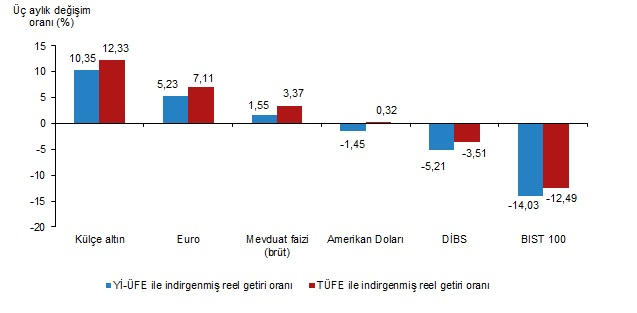 Külçe altın, üç aylık değerlendirmede; Yİ-ÜFE ile indirgendiğinde %10,35, TÜFE ile indirgendiğinde ise %12,33 oranlarında yatırımcısına en yüksek reel getiri sağlayan yatırım aracı oldu. Aynı dönemde BIST 100 endeksi, Yİ-ÜFE ile indirgendiğinde %14,03, TÜFE ile indirgendiğinde ise %12,49 oranlarında yatırımcısına en çok kaybettiren yatırım aracı oldu.