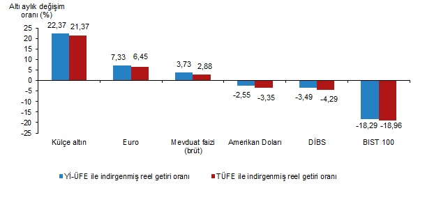 Altı aylık değerlendirmeye göre külçe altın; Yİ-ÜFE ile indirgendiğinde %22,37, TÜFE ile indirgendiğinde ise %21,37 oranlarında yatırımcısına en yüksek reel getiri sağlayan yatırım aracı olurken; aynı dönemde BIST 100 endeksi, Yİ-ÜFE ile indirgendiğinde %18,29, TÜFE ile indirgendiğinde ise %18,96 oranlarında yatırımcısına en çok kaybettiren yatırım aracı oldu.