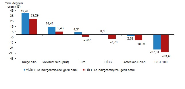 Yıllık değerlendirmede, Yİ-ÜFE ile indirgendiğinde; yatırım araçlarından mevduat faizi (brüt) %14,41, Euro %4,31 ve DİBS %0,16 oranlarında yatırımcısına reel getiri sağlarken; Amerikan Doları %2,62 ve BIST 100 endeksi %27,81 oranlarında yatırımcısına kaybettirdi. TÜFE ile indirgendiğinde ise mevduat faizi (brüt) %5,43 oranında yatırımcısına reel getiri sağlarken; Euro %3,87, DİBS %7,70, Amerikan Doları %10,26 ve BIST 100 endeksi %33,48 oranlarında yatırımcısına kaybettirdi.
