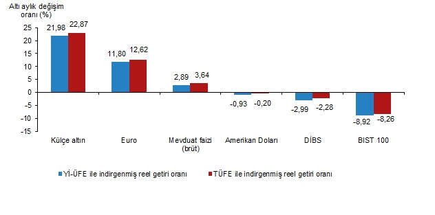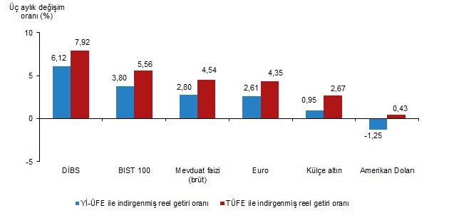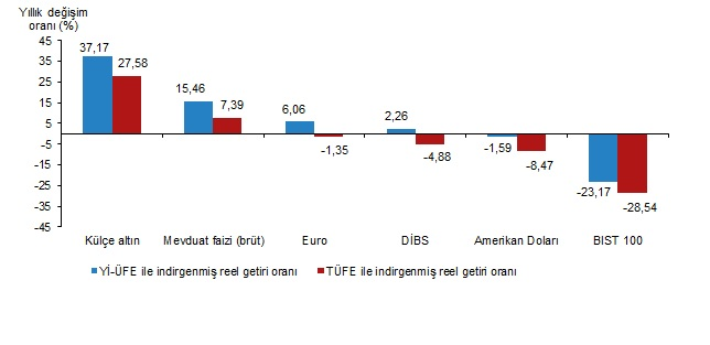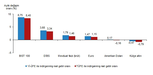 Yİ-ÜFE ile indirgendiğinde; yatırım araçlarından Devlet İç Borçlanma Senetleri (DİBS) %3,68, mevduat faizi (brüt) %1,79, Euro %1,47 ve Amerikan Doları %0,17 oranlarında yatırımcısına reel getiri sağlarken; külçe altın %0,47 oranında yatırımcısına kaybettirdi. TÜFE ile indirgendiğinde ise Devlet İç Borçlanma Senetleri (DİBS) %3,34, mevduat faizi (brüt) %1,46 ve Euro %1,15 oranlarında yatırımcısına reel getiri sağlarken; Amerikan Doları %0,16 ve külçe altın %0,79 oranlarında yatırımcısına kaybettirdi.
