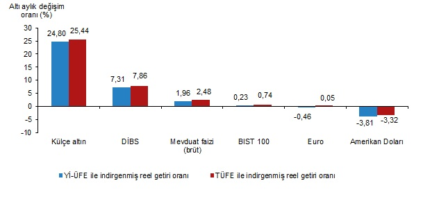 Altı aylık değerlendirmeye göre külçe altın; Yİ-ÜFE ile indirgendiğinde %24,80, TÜFE ile indirgendiğinde ise %25,44 oranlarında yatırımcısına en yüksek reel getiri sağlayan yatırım aracı olurken; aynı dönemde Amerikan Doları endeksi, Yİ-ÜFE ile indirgendiğinde %3,81, TÜFE ile indirgendiğinde ise %3,32 oranlarında yatırımcısına en çok kaybettiren yatırım aracı oldu.