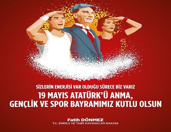 Enerji ve Tabi Kaynaklar Bakanı (ETKB) Fatih Dönmez: 'Asırlar boyu yanacak Milli Mücadele ateşinin sembolü ve o ateşin koru olan gençliğimizin bayramı 19 Mayıs Atatürk’ü Anma, Gençlik ve Spor Bayramı kutlu olsun. Başta Gazi Mustafa Kemal Atatürk ve silah arkadaşları olmak üzere tüm gazi ve şehitlerimizi rahmetle anıyorum.'