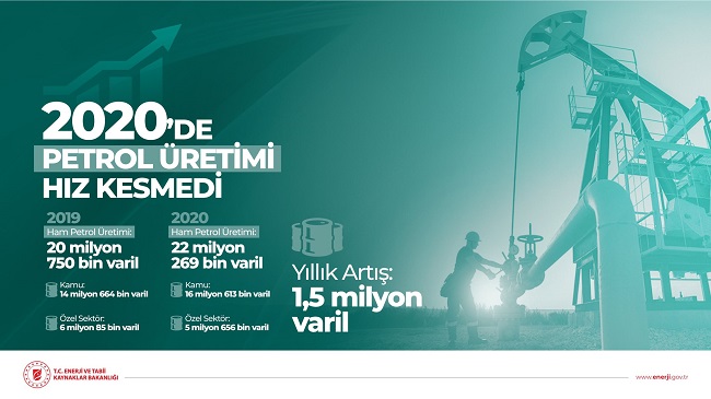 Enerji Ve Tabi Kaynaklar Bakanı Fatih Dönmez, sosyal medya üzerinden duyurdu: '2020’de enerjinin her alanında attığımız adımlar petrol üretiminde de hız kesmedi. Petrol üretimimiz 2020’de, bir önceki yıla göre 1,5 milyon varil artarak 22 milyon varili aştı.