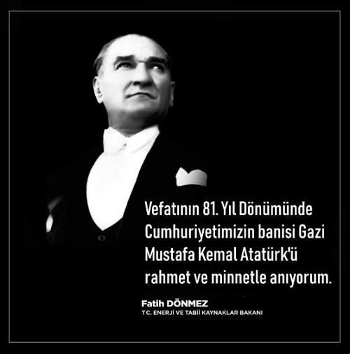 Enerji ve Tabi Kaynaklar Bakanı (ETKB) Fatih Dönmez: Vefatının 81. yıl dönümünde Cumhuriyet’imizin banisi Gazi Mustafa Kemal Atatürk’ü rahmet ve minnetle anıyorum.